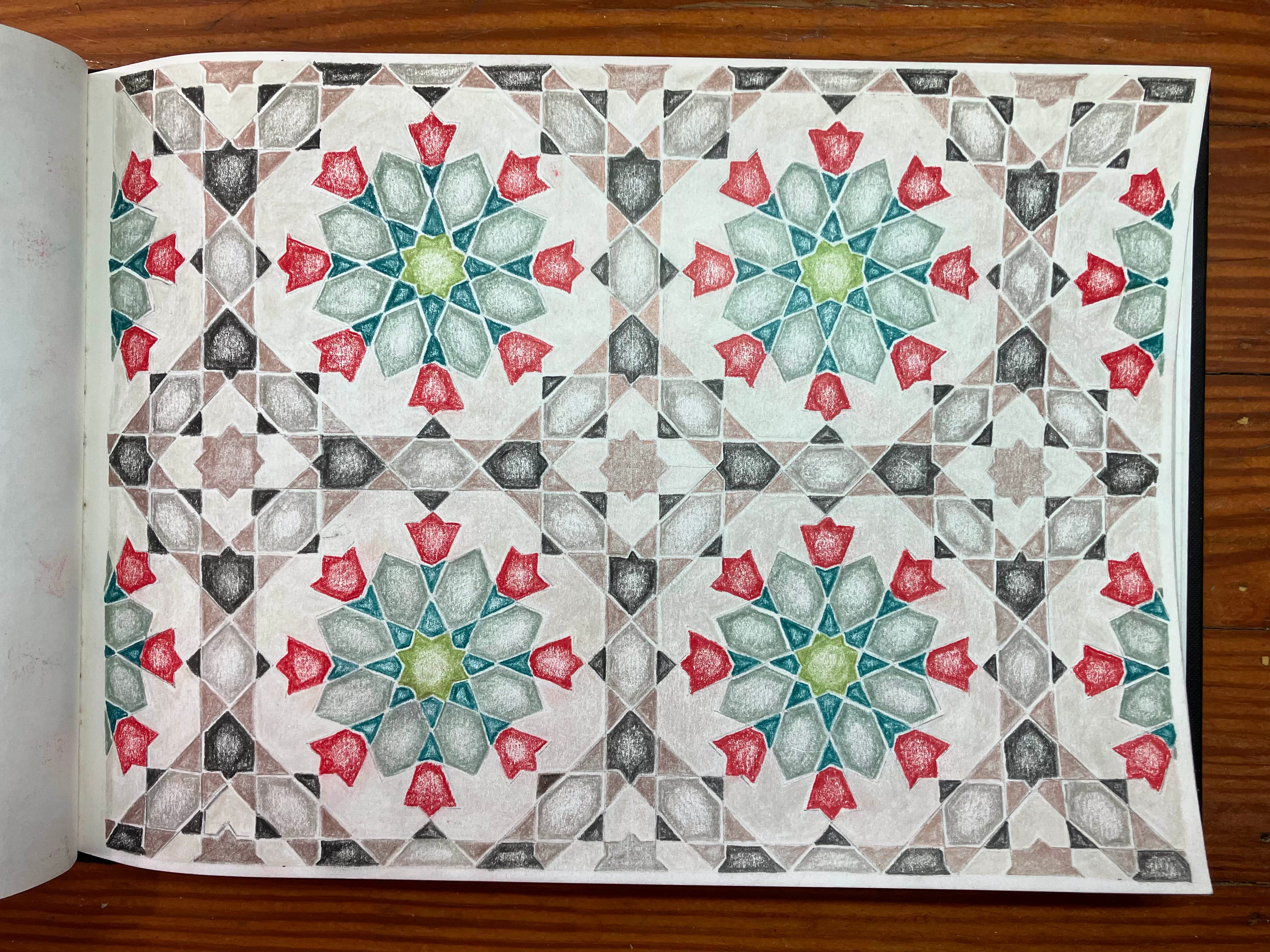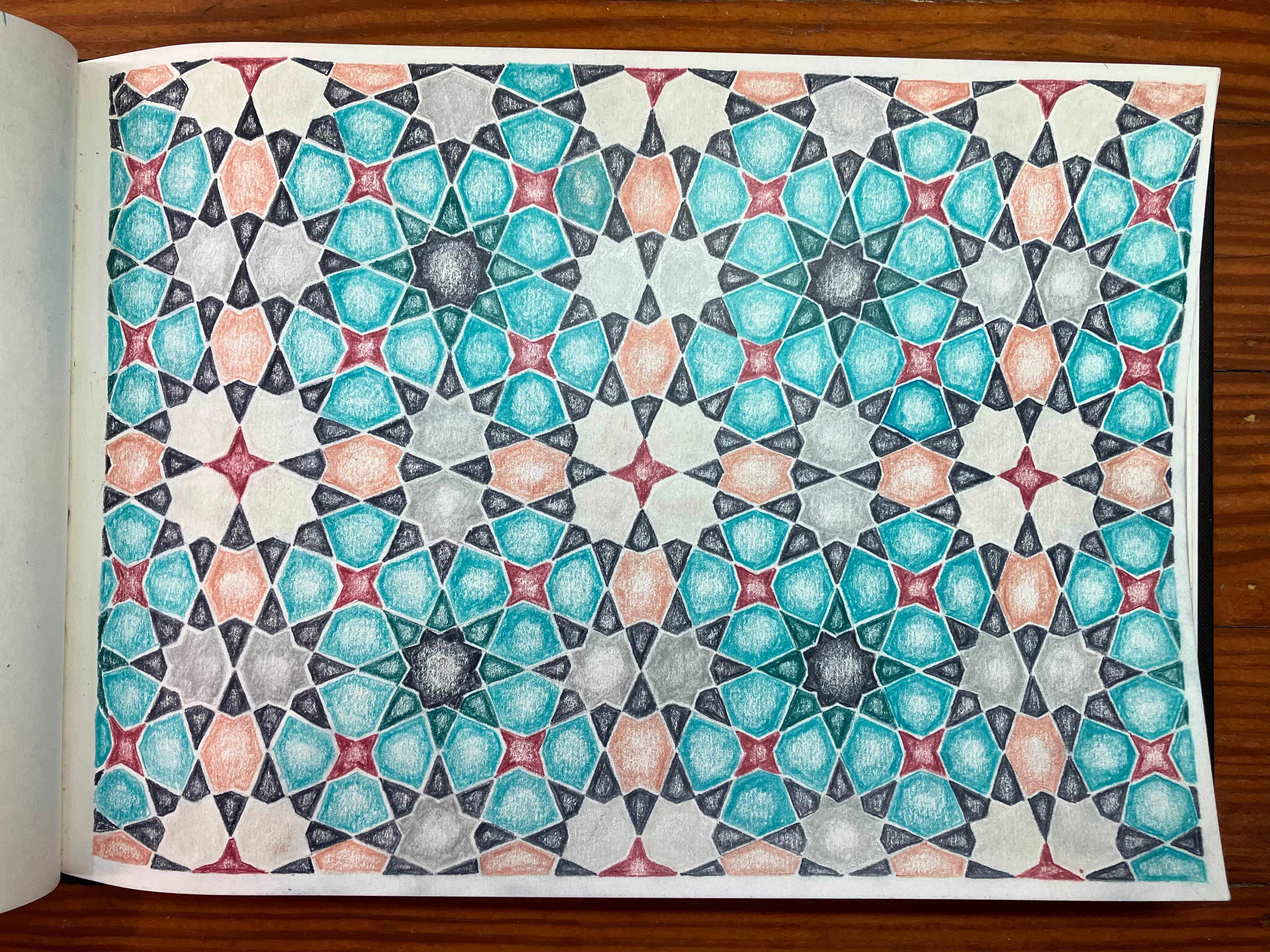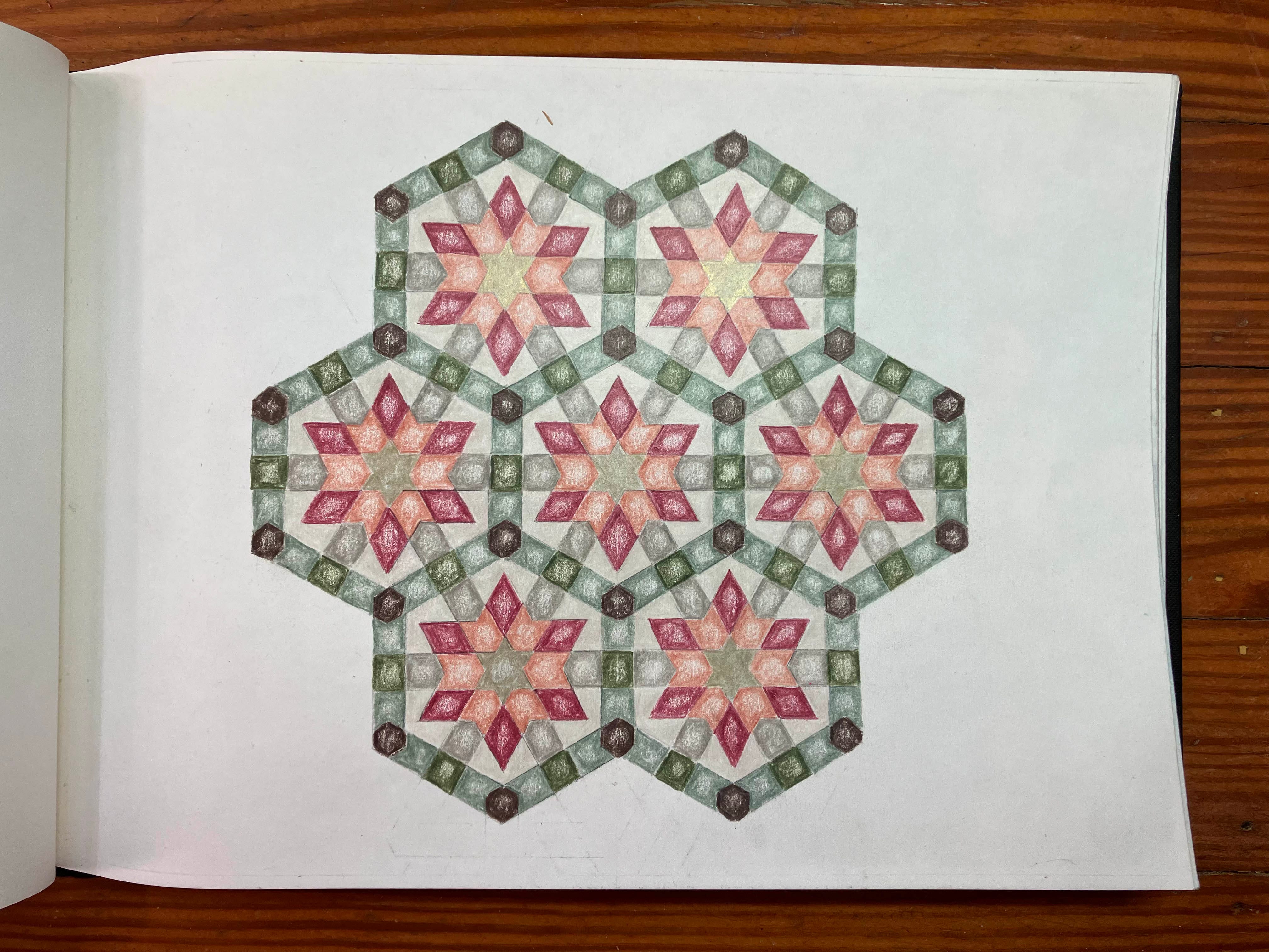 During my better months last year, I set up my dining room table to be an art table. It’s still covered with art supplies today while I lay here in bed. But, as you may have learned in my last episode, I’ve become very interested in Islamic geometric patterns. This kind of art touches my brain in such a beautiful way. Back in 10th grade, I loved geometry… and then I forgot about it for about 40 or 50 years. But I love me some geometry. I love shapes. I love angles. I love circles. And I love tessellating patterns.