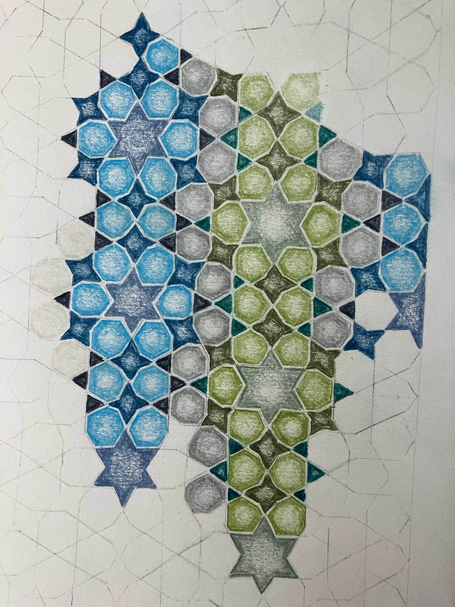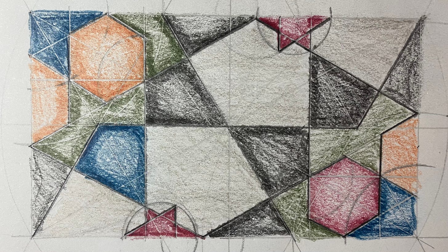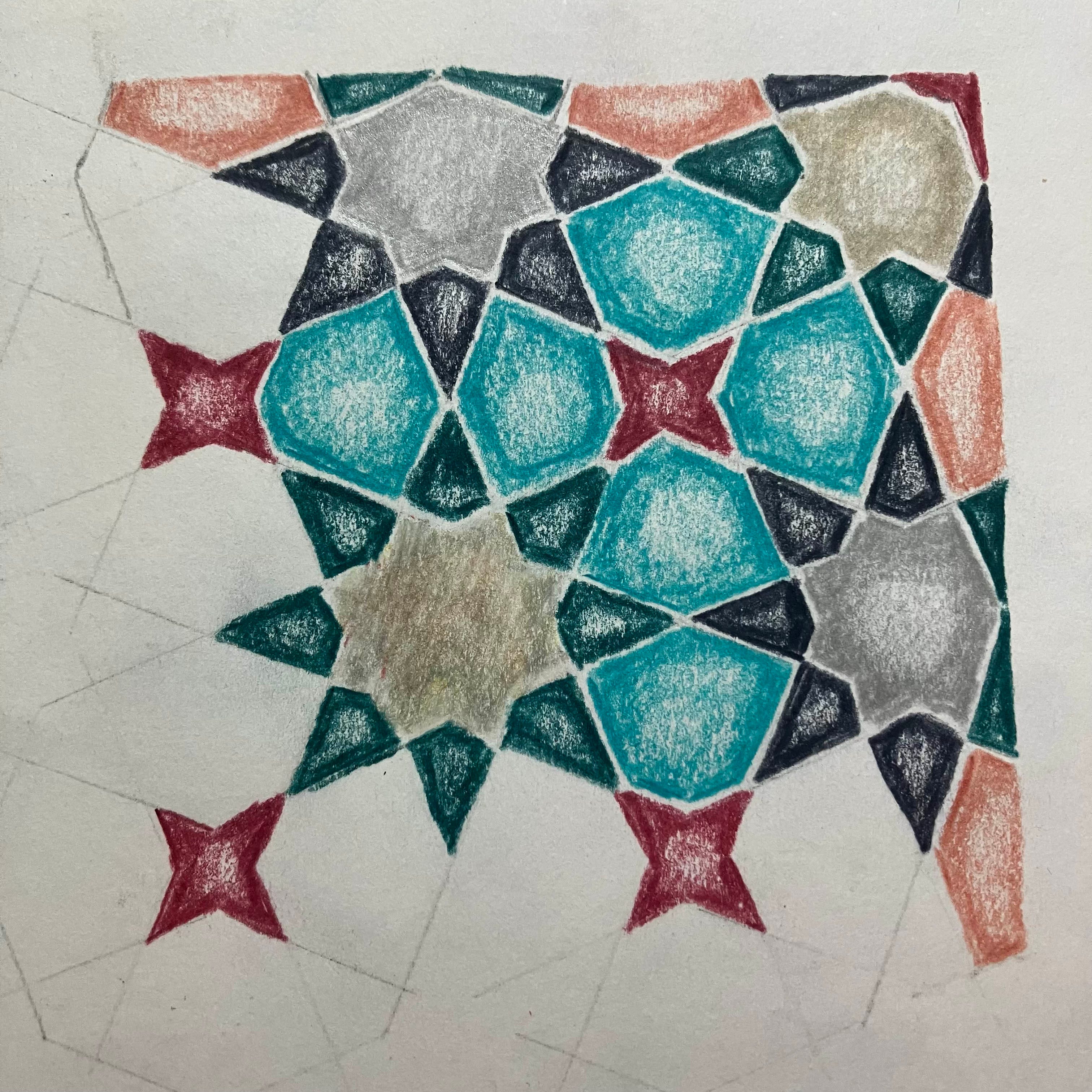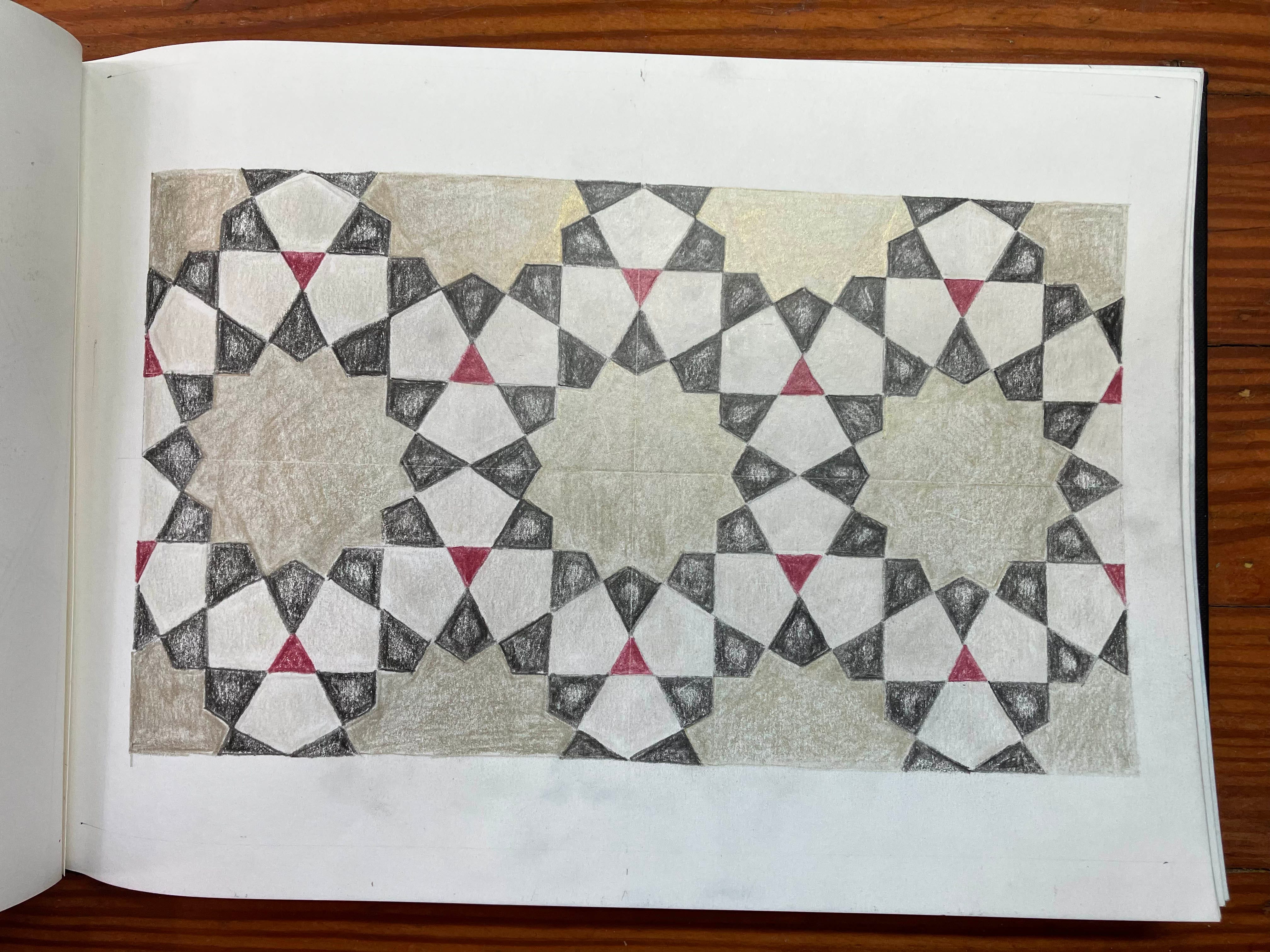So I signed up for a couple online classes at the Global Islamic Art Academy led by Mohammed Al Janabi, who teaches a very systematic way of drawing these traditional patterns. He’s been doing it for about 70 years, I think. He learned it from his father. I’m learning to follow very precise instructions to create circles and stars and rosettes and kite shapes — coming together to form these gorgeous, intricate, traditional, repeating Islamic patterns.