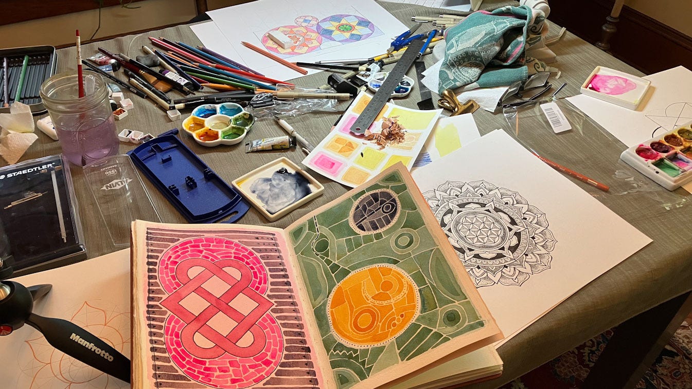 I spent this week drawing. I spent this week getting into sacred geometry. I bought myself a drawing compass and a straight edge. I've turned my dining room table into an art studio. And I took a little picture of it before cleaning up. It's a mess. I've been spending my days surrounded with watercolors and colored pencils and water soluble crayons and Micron pens. Yep, the way keeps opening in unexpected ways. I mean, two weeks ago, I'd never even heard of sacred geometry. Now I'm obsessed. That's all I want to do. I’m looking forward to sharing more of that with you and other things as well.