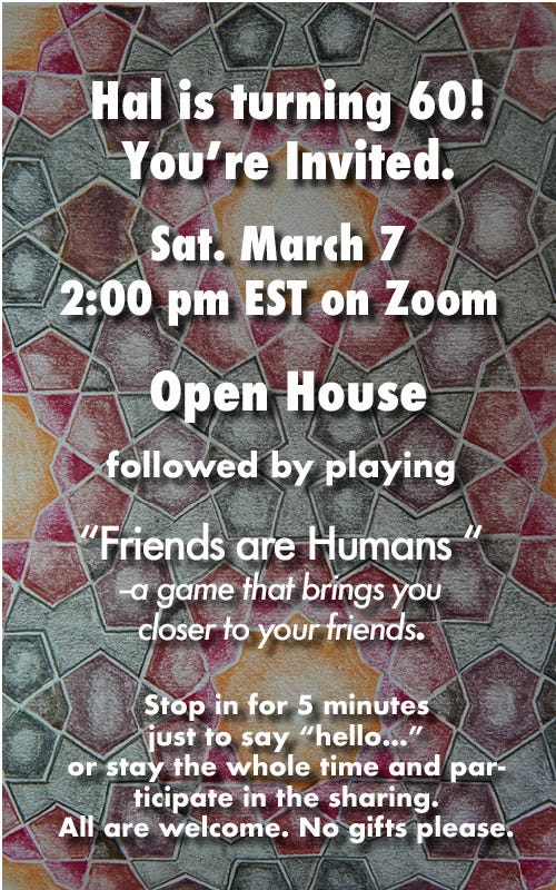 On Saturday, March 7 at 2:00 pm EST, I’m hosting a Zoom gathering to celebrate my 60th birthday. I hope you’ll stop by for a few minutes to say “hello.” Feel free to stay as long as you’d like. You’ll find the Details and Zoom link below.